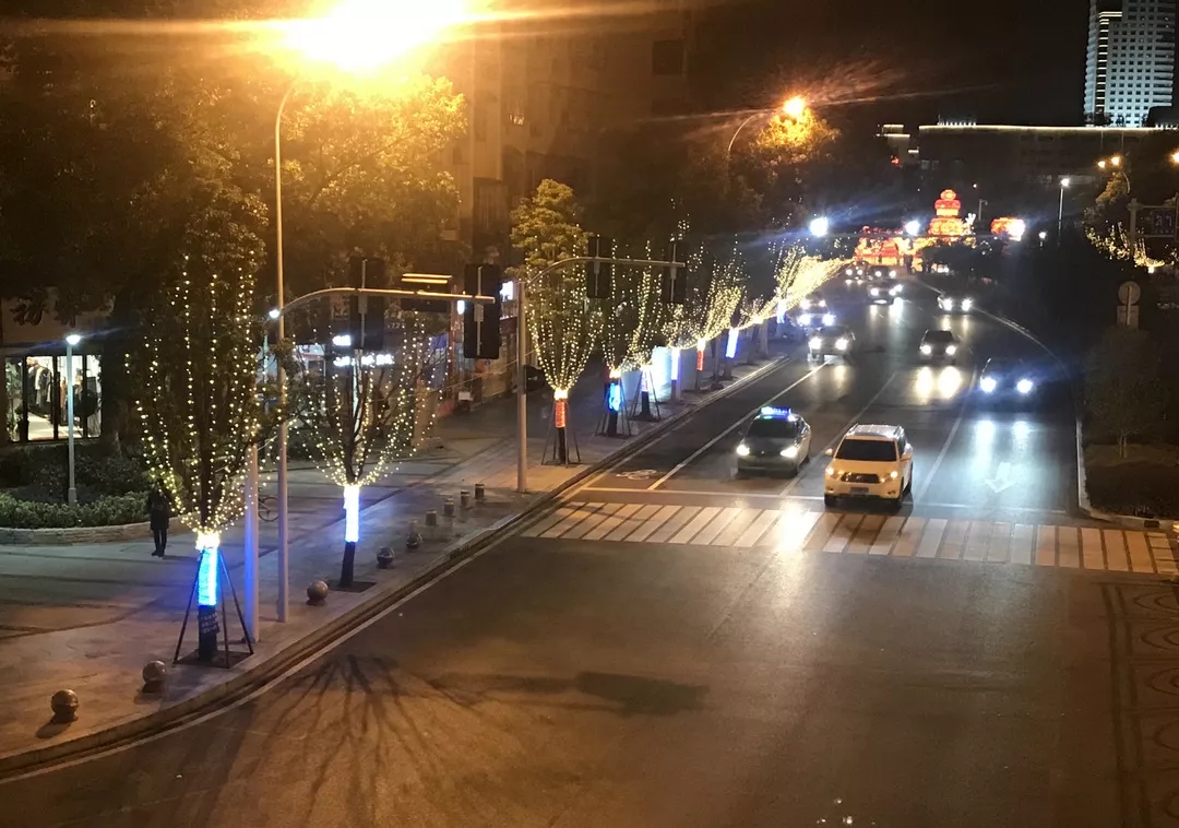石子嶺路道路兩旁的近百棵樹(shù)木也被各色彩燈裝扮得分外美麗。